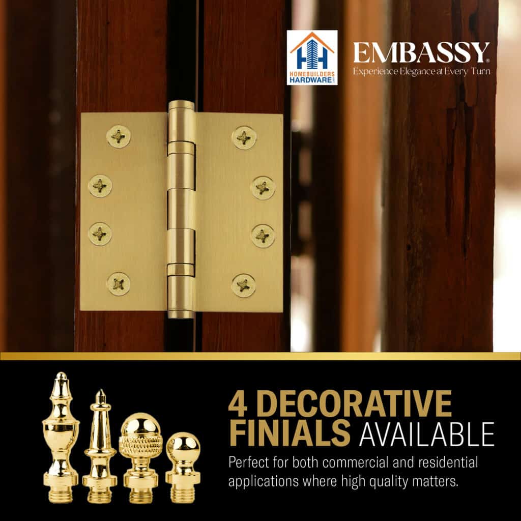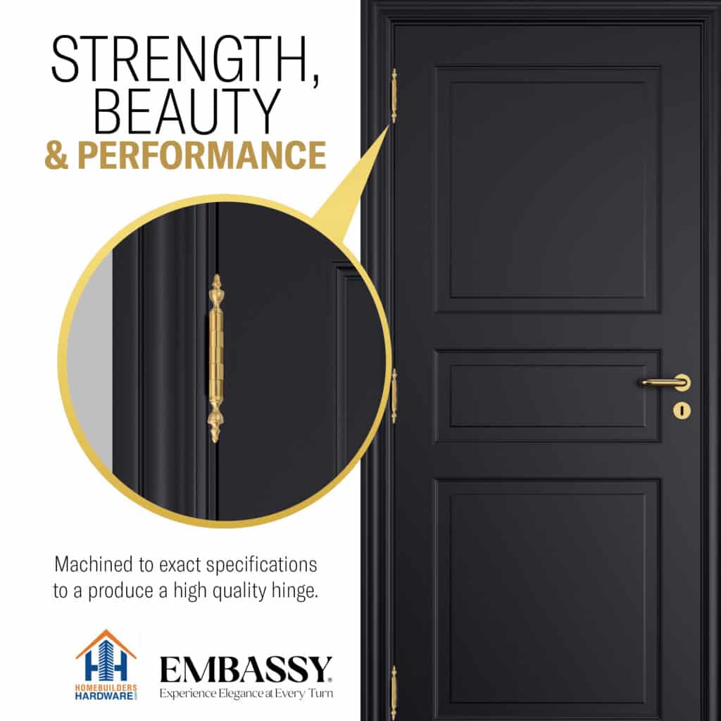 These Embassy® Solid Brass Hinges are machined to exact specifications, giving you a high-quality hinge that provides long lasting strength and performance.