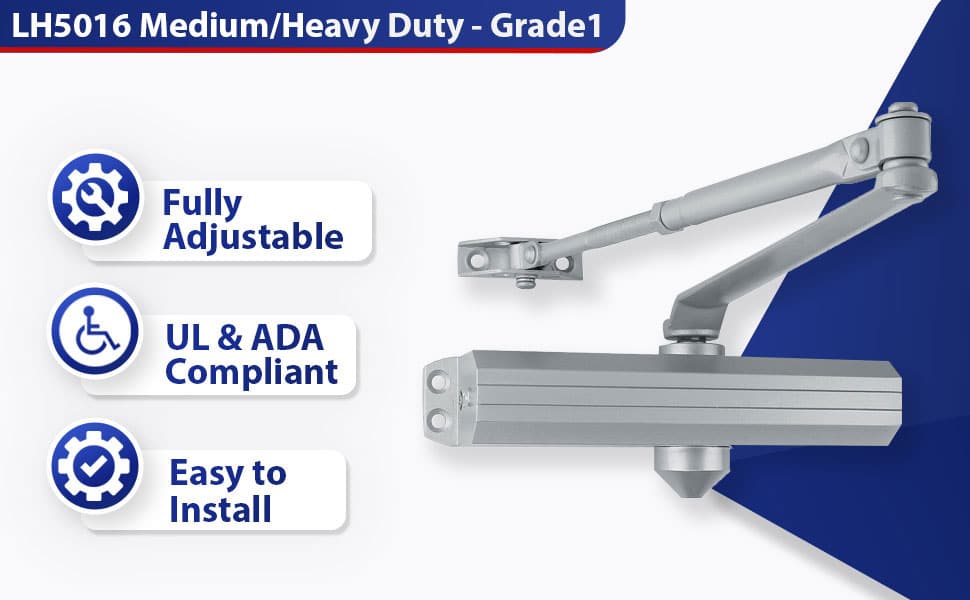 Medium/Heavy Duty — Aluminum Storefronts or similar. This performance-tested and BHMA/ANSI-certified Grade 1 door closer is for medium duty and light commercial applications, both indoors and outdoors. It will easily handle 2,000 openings per day, providing smooth, reliable use for many years to come.