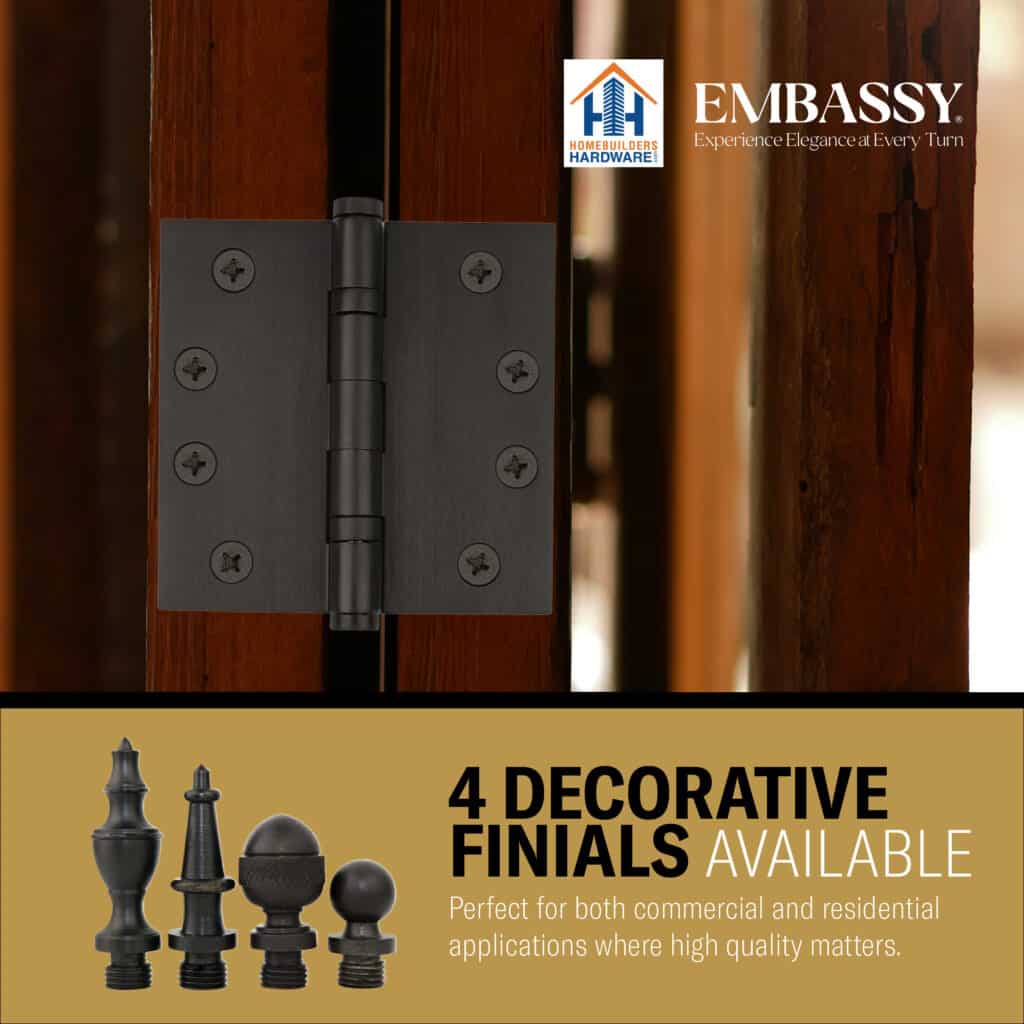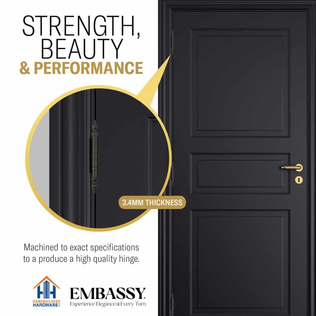 These Embassy® Solid Brass Ball-Bearing Hinges are machined to exact specifications, giving you a high-quality hinge that provides long lasting strength and performance. For both standard and heavy doors, ball-bearing hinges provide greater support, smoother action, and longer performance than standard hinges.